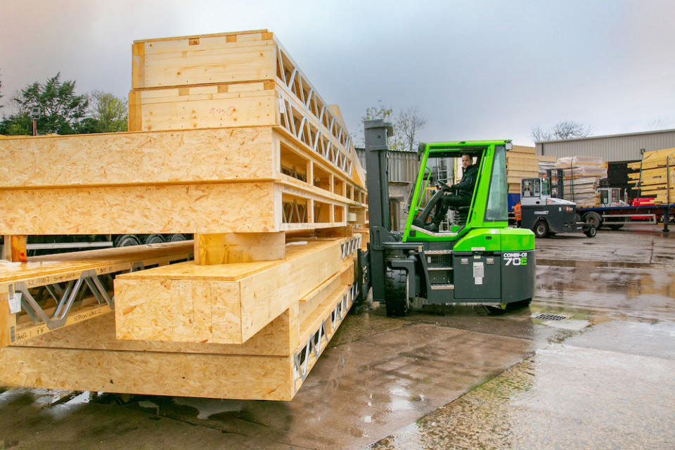 Die Designmerkmale des leistungsstarken Combi-CB70E, wie die großen Superelastikreifen und der kompakte Radstand, sind ideal für die Anforderungen der Holzindustrie geeignet. Mit einer Hubkapazität von 7.000 kg/15.500 lb verfügt dieses Modell über eine beeindruckend kleine Standfläche und eine außergewöhnliche Wendigkeit, so dass es auch sperrige Holzladungen auf engem Raum problemlos bewegen kann.